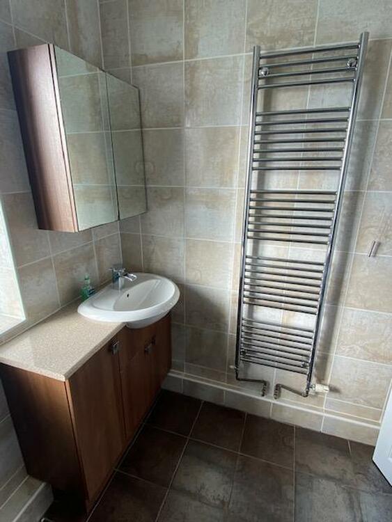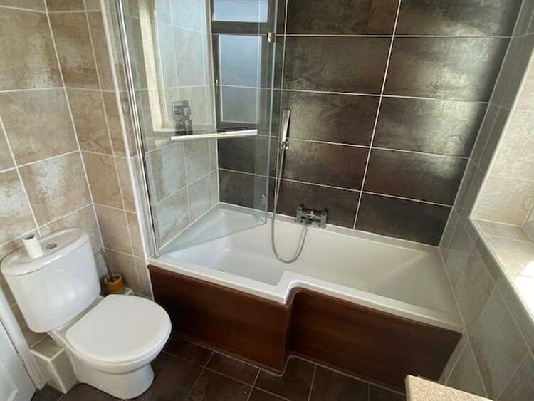 With uPVC double glazed window to the rear elevation and comprising a panelled bath with mixer tap shower attachment, shower head over, glazed shower screen, low level wc, vanity wash hand basin with cupboards beneath, preparation surface and wall mounted glass mirrored cupboards, tiling to the walls and chrome laddered heated towel rail.