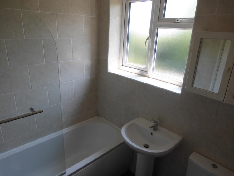 Bathroom with white suite, shower over bath, tiled walls, double glazed window and central heating boiler.