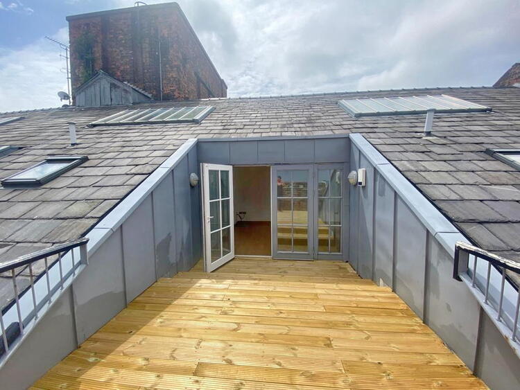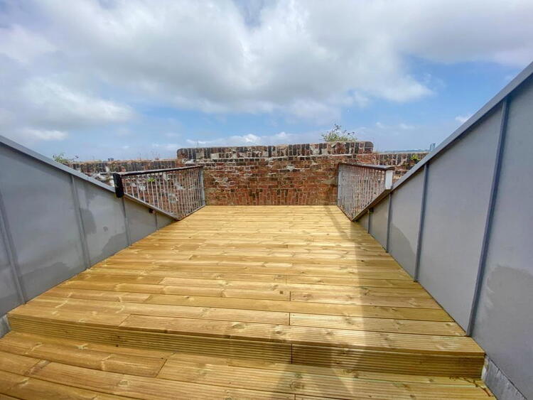 The Penthouse is split over two floors with the bedrooms on the ground floor and the kitchen and living area to the first floor with access to the decking outside.
