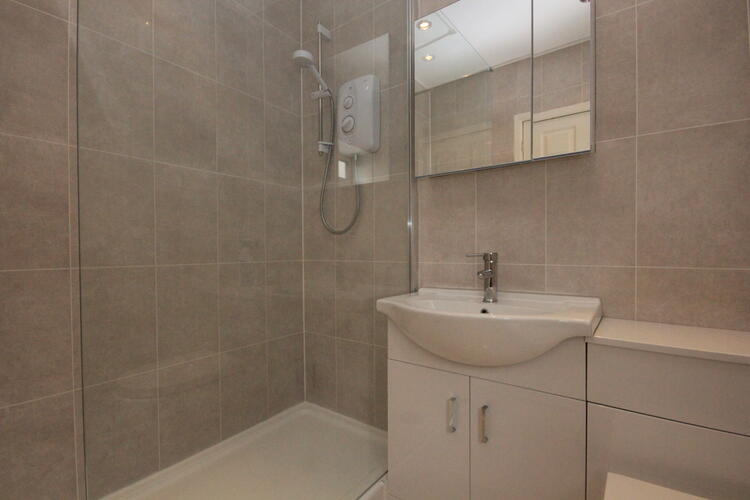 Fitted with a double shower, wash hand basin and low flush toilet set to a high gloss white vanity unit. Also fitted is a central heating radiator, tiled effect panelling to the walls, a tiled ceramic floor, spot lights to the ceiling, an extractor fan to the wall, and a UPVC double glazed window viewing to the side of the property.