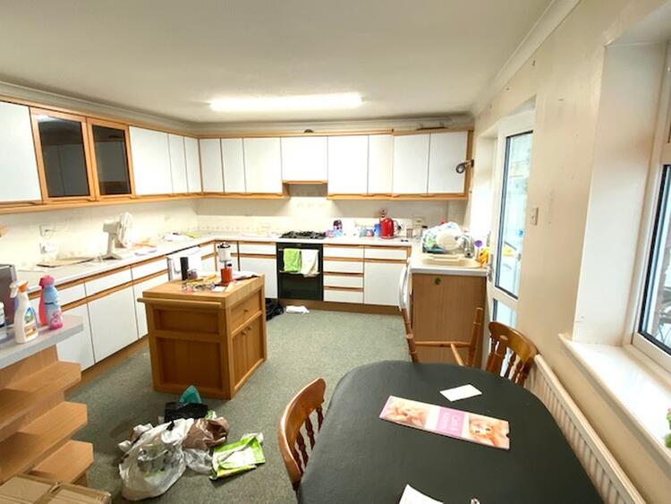 With uPVC double glazed window and door to the rear elevation. The fitted kitchen comprises a range of wall mounted cupboards with matching base units, drawers, preparation surface, sink and drainer with mixer tap and splashback tiling. Integrated appliances comprise a double electric oven with a four ring gas hob, cooker hood over, plumbing for washing machine and central heating radiator.