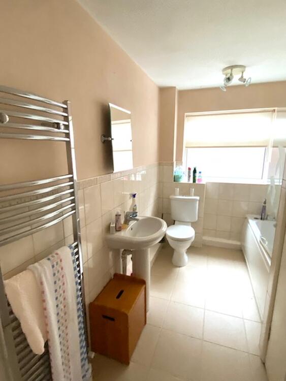 With uPVC double glazed window to the side elevation. Fitted with a three piece suite in white comprising a panelled bath, low level wc, pedestal wash hand basin, tiling to walls and floor, chrome laddered heated towel rail and airing cupboard.