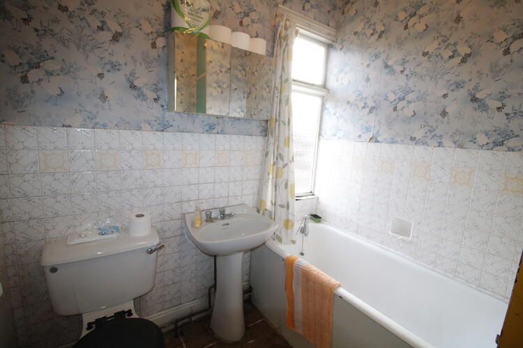 With low flush wc, Armitage ware pedestal wash basin, cast iron bath, former airing cupboard, central heating radiator and opaque window to the front elevation.