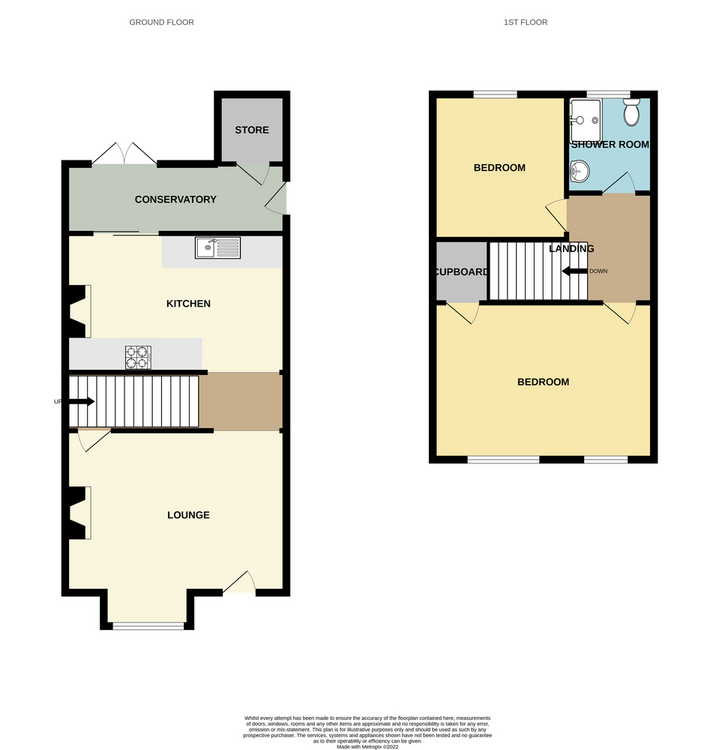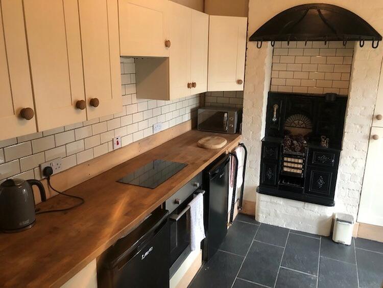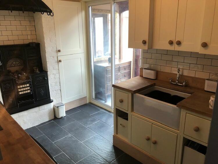 With a good range of base and wall units, solid wood worksurfaces with inset Belfast sink. Feature Cast Iron range inset to chimney breast. LArge utility cupboard with space for washing machine and tumble dryer. Patio door to conservatory.