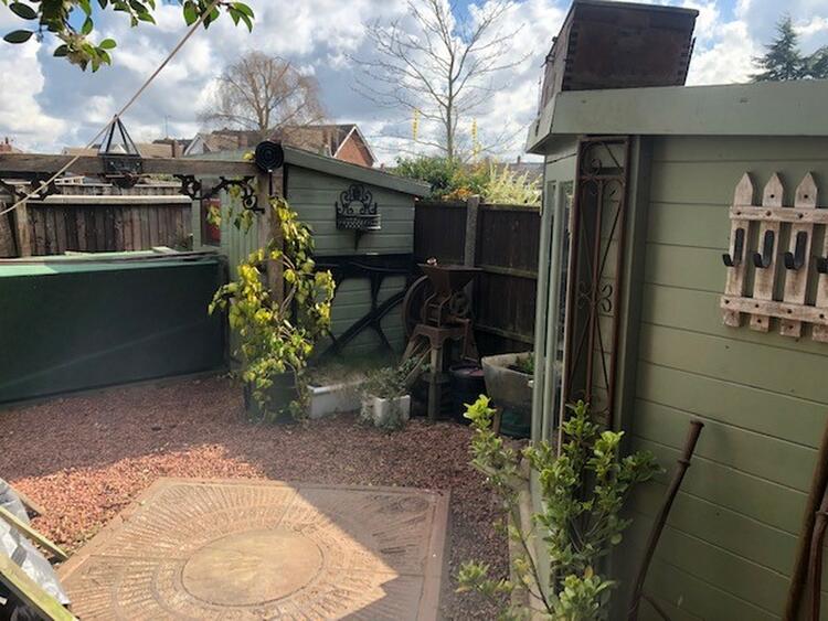 An easily managed rear garden with log store, summer house, two timber sheds and patio seating area. The garden is fully enclosed by fencing.