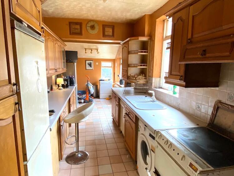 With window to rear and side elevation and door to side. The fitted kitchen in light oak units comprises a range of wall mounted cupboards with matching base units, drawers, preparation surface, sink and drainer with splashback tiling, integrated appliances, cooker point, plumbing for washing machine and central heating radiator.
