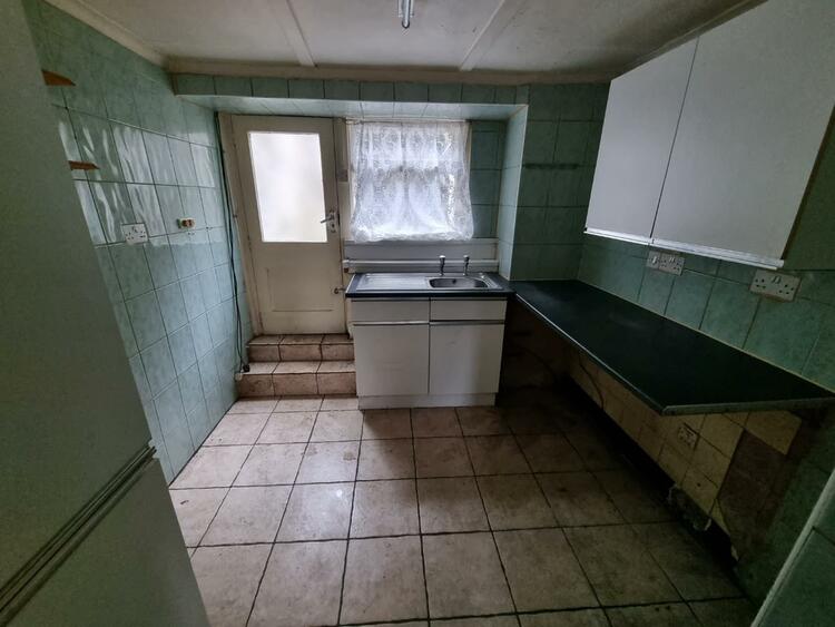 A fully tiled room with a rear aspect, single glazed window and rear aspect door overlooking and providing access to the rear garden. Fitted with matching white wall and base units, roll edged worktops and a stainless steel sink. There's space and