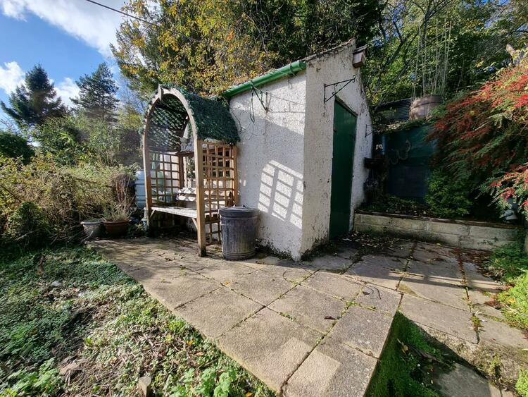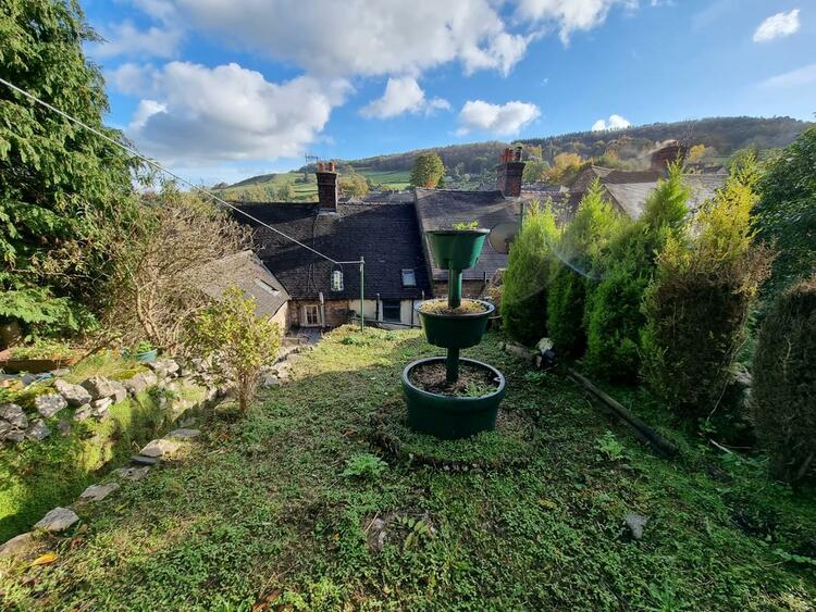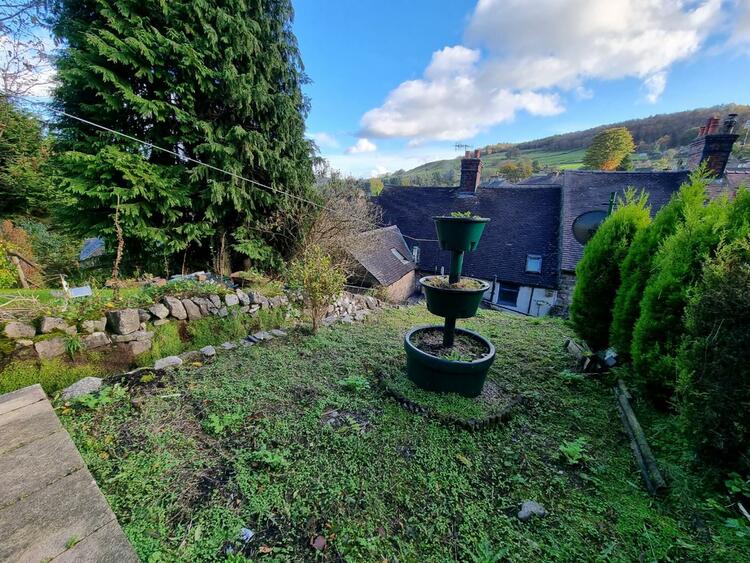 The property benefits from a small forecourt, ideal for a garden bench or some potted plants and a lovely rear garden which can only be accessed through the house. From the kitchen, direct access is given to a small courtyard where there's a handy outdoor store (0.91m x 1.68m) which is likely to have been an outdoor WC previously. This store could easily be converted back to a WC or into a Utility Area. Stone steps lead past a timber shed which has power and light and to more steps which lead to the top garden tier. Here there is a lawned area with bordering stone walls and hedgerow and a quaint patio area with the most spectacular roof top countryside views. From here there is also a: