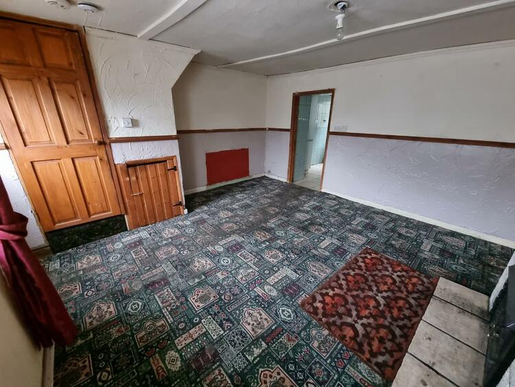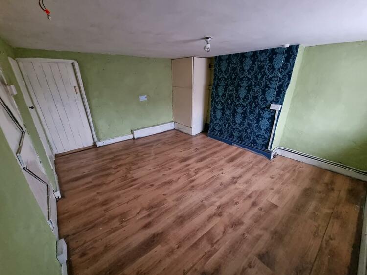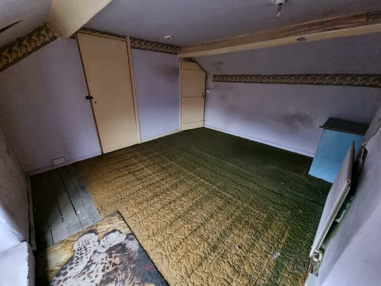 A second double bedroom with a front aspect single glazed window and wooden storage box which houses the cold water tank. A wooden door opens to a good sized storage cupboard which could be converted into a separate WC if desired.