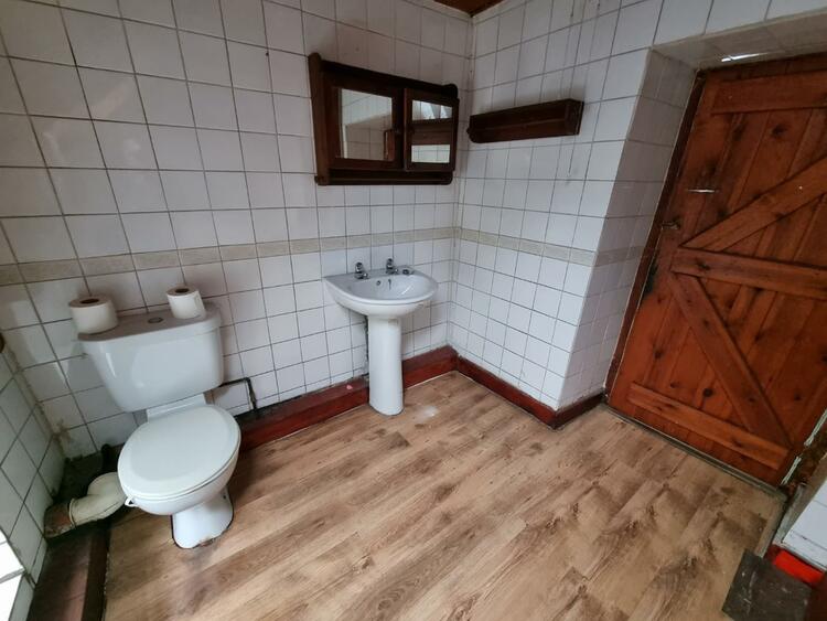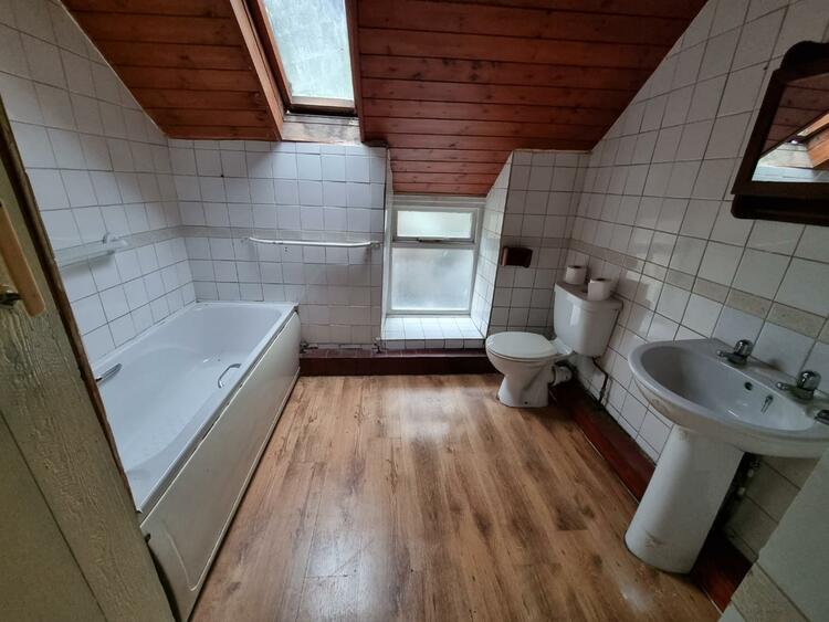 A fully tiled room with a rear aspect single glazed window with obscure glass and a Velux roof window providing further natural light. Fitted with a three piece suite consisting of white panelled bath, dual flush WC and pedestal wash hand basin. There is a wooden panelled ceiling and a handy storage cupboard.