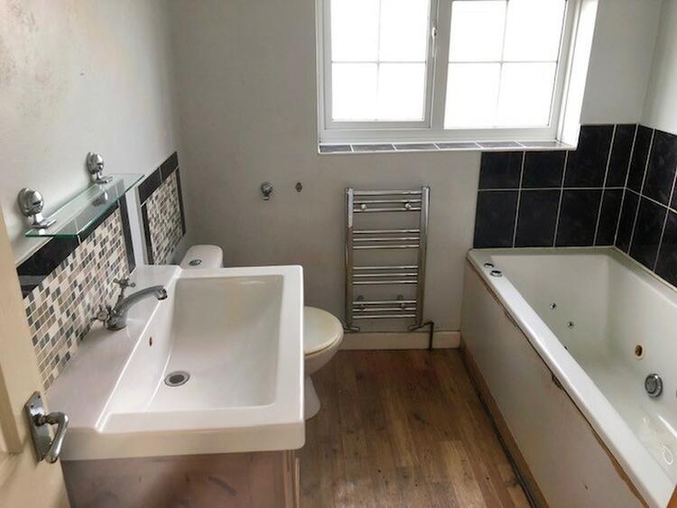 With low flush wc, wash hand basin in vanity unit and jacuzzi bath. Part tiled, radiator and window to the rear.
