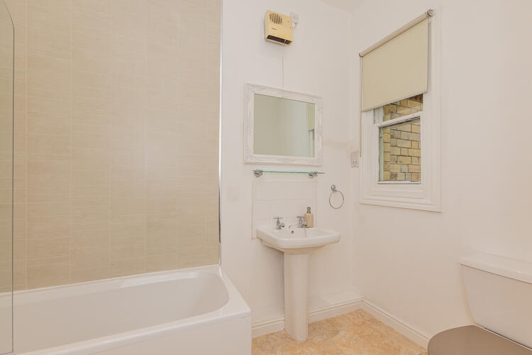 Three-piece suite, Bath, shower over, Tiled surrounds, pedestal basin.
