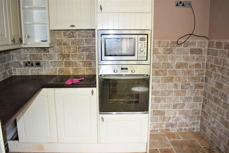 Appointed with a range of high and low white fronted units with contrasting dark woodgrain worktops to include belfast style ceramic sink with mixer tap and cupboard under, space and plumbing for an automatic washing machine, venting for a tumble drier, inset electric hob, built in oven and microwave with stores over and under, spotlighting, Pvcu double glazed window, 1/2 tiled walls, rear entrance door and stone effect tiled floor. An inner vestibule with fitted store cupboards leads to the