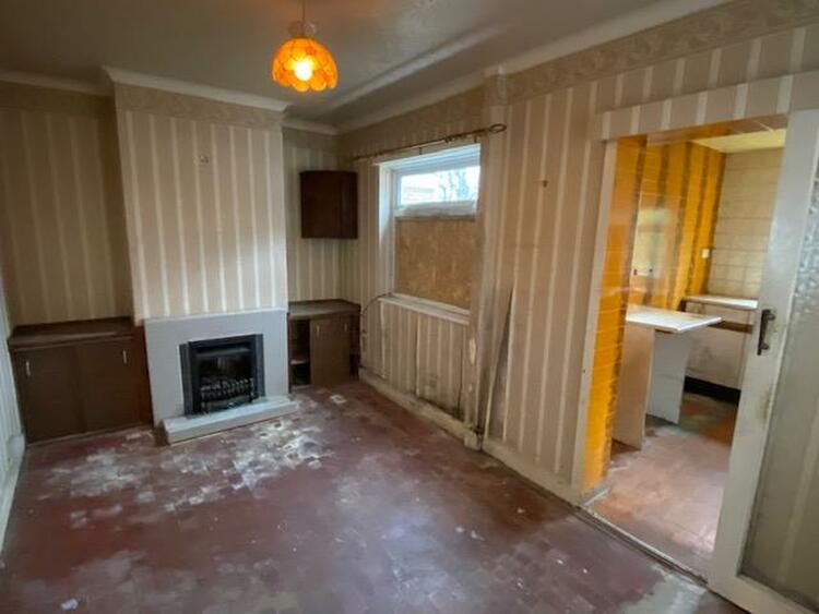 With uPVC double glazed window to the rear and side elevation currently boarded up, gas fire incorporating a coal living flame effect with a tiled back and hearth, fitted cupboard and useful under stair storage cupboard.