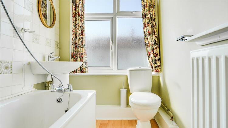 The bathroom includes a white suite which comprises, WC, wash hand basin and bath with overhead shower, has an obscure double glazed window to the side aspect, ceiling light point, gas central heated radiator and wood effect flooring.