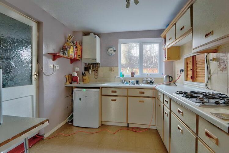 uPVC window overlooking the rear elevation. A range of wooden kitchen cabinets, integrated oven and grill, a sink with drainer and space for stand alone fridge and freezer. A door leads into the hallway and another door leads to the inner hallway.