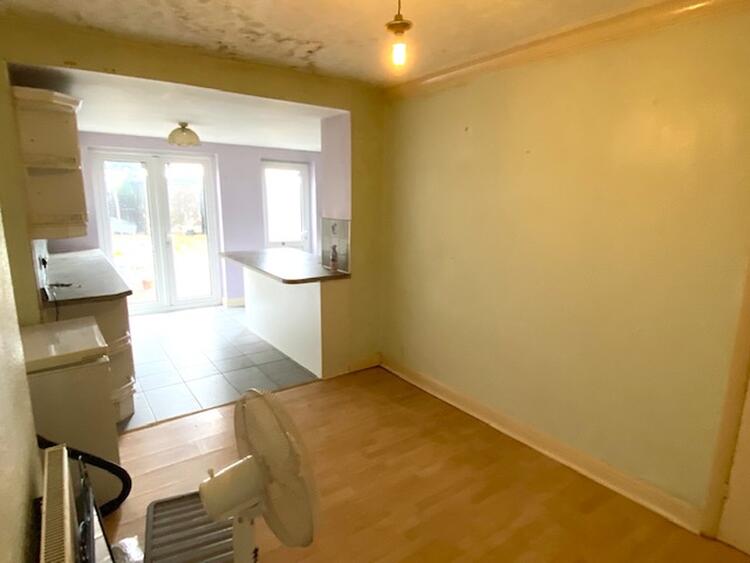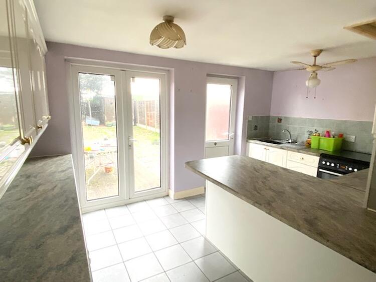 With uPVC double glazed window and patio door to the rear elevation. The fitted kitchen comprises a range of wall mounted cupboards with matching base units, drawers, preparation surface, stainless steel sink and drainer with splashback tiling. There is a cooker point and central heating radiator.