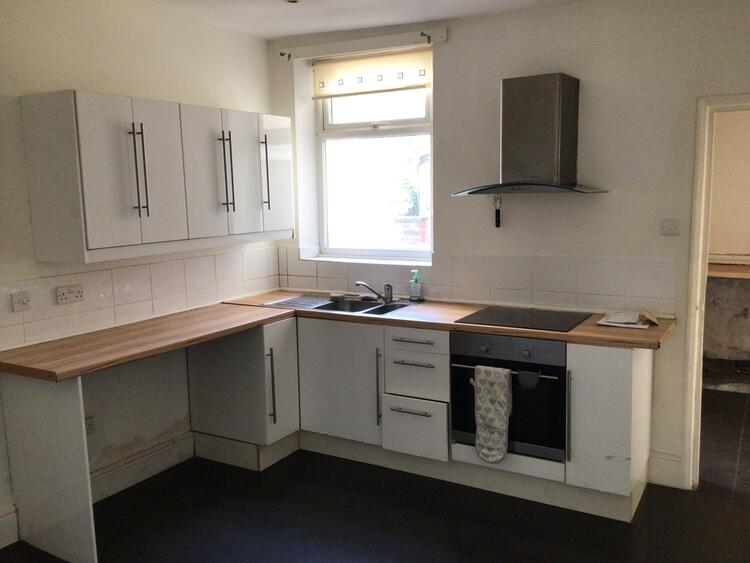 With uPVC double glazed window to the rear elevation. The fitted kitchen with white high gloss units comprise a range of wall mounted cupboards with matching base units, L-shaped preparation surface with stainless steel sink and drainer, mixer tap and splashback tiling. Integrated appliances comprise a stainless steel electric oven with a chimney style fan assisted illuminated cooker hood over, space for fridge/freezer and breakfast bar, polished tiled floor covering, central heating radiator and staircase to first floor.