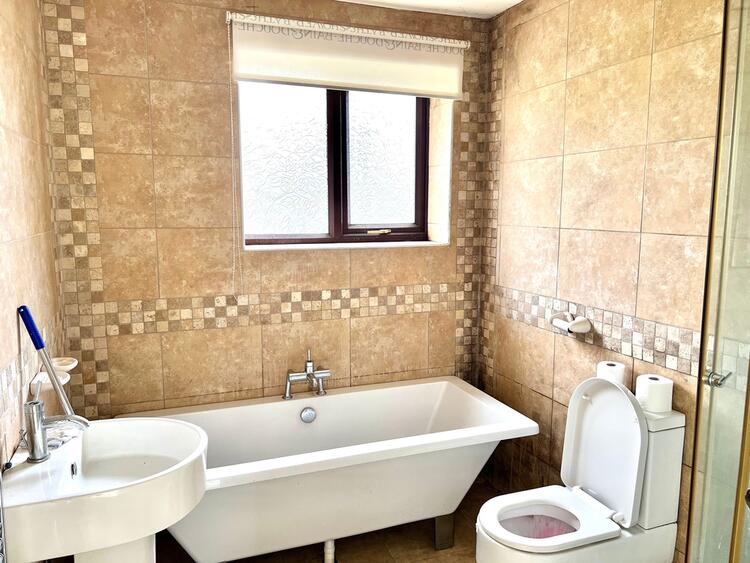5.357m x 2.267m to widest points. An extended kitchen with two uPVC double glazed windows and a uPVC double glazed door, radiator, fitted wall and base units, stainless steel sink, plumbed for washer, gas cooker point, extractor hood.