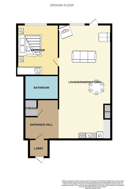 Entrance hall, open plan kitchen/living/dining room, bedroom, bathroom