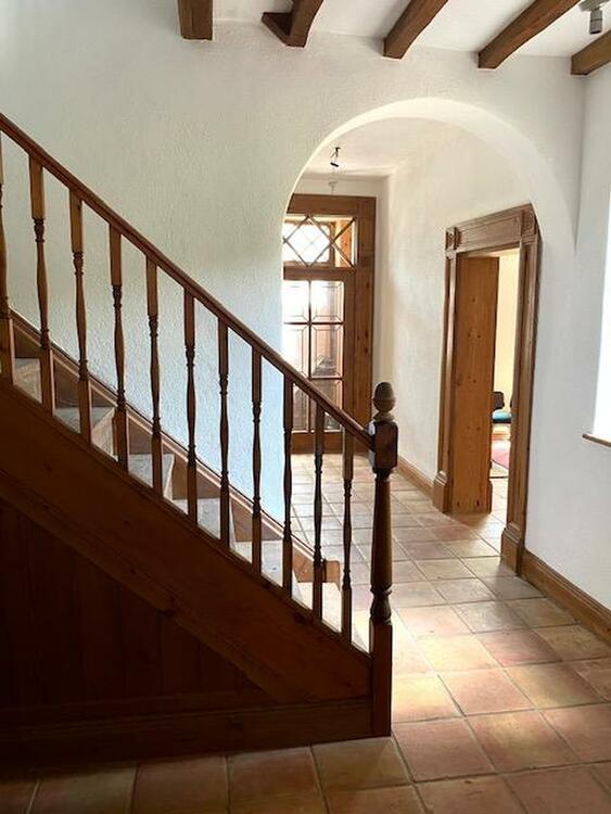 Split level landing with continuation of the spindle balustrade, exposed ceiling beams and staircase to attic room.
