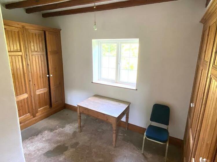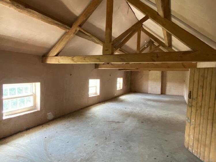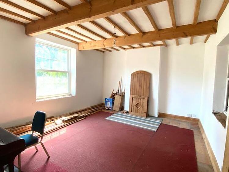 42 ft 7 into recess by 14 ft 6 with three double glazed low level windows to the front elevation, original trusses and latched door.