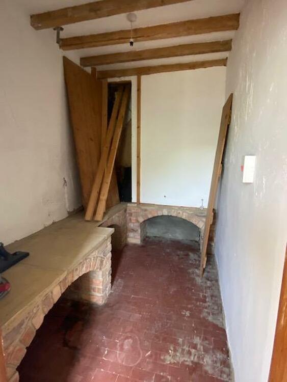 24 ft 2 reducing to 15ft5 by 23ft3 (Please note this isnt a regular shape room). With three double glazed windows and a feature open inglenook fireplace. This thoughtfully designed bespoke handmade kitchen is fitted in reclaimed pine units with marble preparation surface, double French farmhouse sink with mixer tap, exposed ceiling beams, terracotta tiled floor, staircase to first floor.