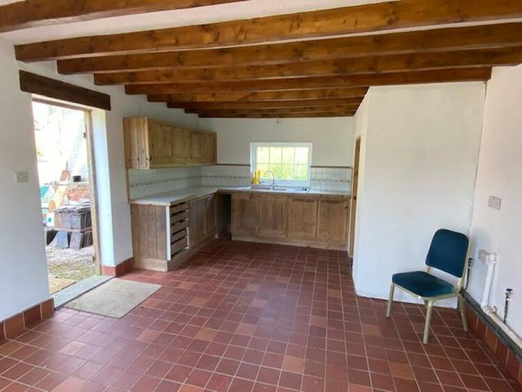 19 ft by 12 ft 10 (please note this is an irregular shaped room) with two double glazed windows, handmade units with preparation surface, resin bowl and half a sink and drainer and mixer tap. There is also plumbing for washing machine and exposed ceiling beams. Guest WC measures 6 ft 10 by 3 ft.