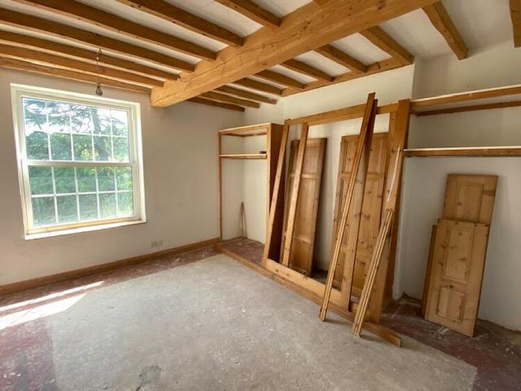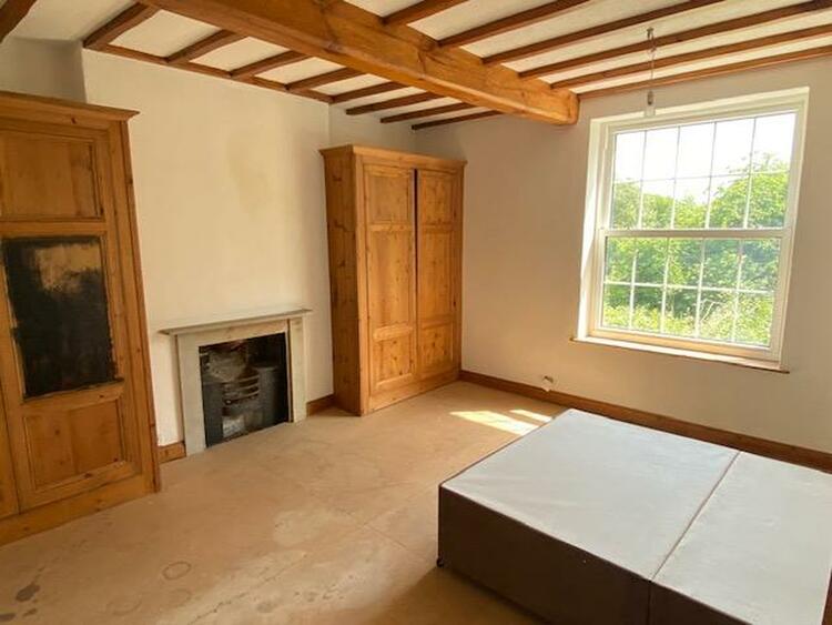 16 ft 5 by 14 ft 6 (Please note this is an irregular shape room) with multi paned double glazed window, exposed ceiling beams, original panelled door, original open grate fireplace and steps leading down to the dressing area which measures 15 ft 1 into wardrobe by 6 ft 9 with double glazed window and a comprehensive range of bespoke handmade pine fitted wardrobes.