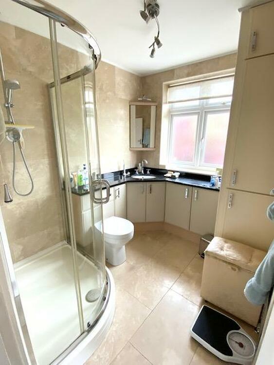 With uPVC double glazed window to the rear elevation. A thoughtfully designed and quality fitted bathroom suite comprises a quadrant shower tray with shower unit over and glazed shower screen, concealed low level wc with vanity wash hand basin incorporating an L-shaped granite preparation surface with circular sink and mixer tap, floor-to-ceiling fitted cupboard with Travertine tiled walls and floor covering along with a chrome laddered heated towel rail, a range of down-lighters with extractor fan.