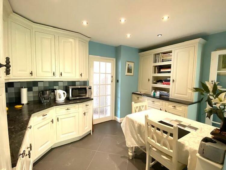 Fitted in cream style Shaker units with wall mounted cupboards, base units, preparation surface, Franke sink with mixer tap and splashback tiling, Bosch washing machine and separate tumble dryer included, wall mounted Worcester boiler, central heating radiator, a range of down-lighters, inset door mat with tiled floor covering.