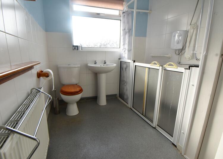 Having a double walk-in shower area with wall mounted electric shower and floor drain, low flush WC, pedestal wash hand basin, obscure double glazed window to rear, tiling to water prone areas, radiator, ceiling light point, non slip flooring and useful airing cupboard