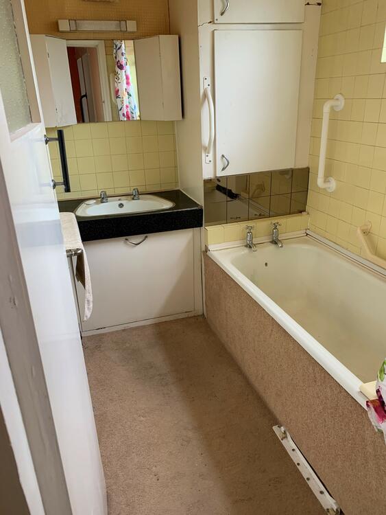 Includes sink, bath with stainless steel taps, electric shower, linen storage cupboard which contains the hot water tank, single glazed window to rear elevation, and heated towel rail.