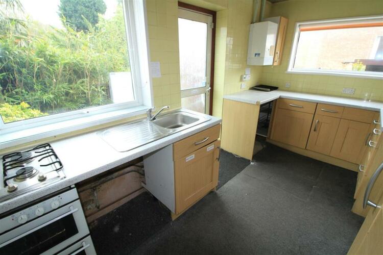 Includes a range of wall and base units, rolltop worktops, electric fan double oven, two ring gas hob, double glazed window to side elevation, double glazed window to rear elevation, stainless steel sink with stainless steel mixer tap, space for washing machine, dryer or dishwasher, glowworm economy gas boiler for central heating system, sliding door to understairs storage area with access to void under floor, and door to rear garden.
