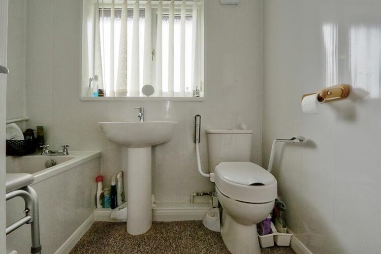 A white bathroom suite comprising pedestal wash hand basin, low level w/c and panelled bath tub wit wall mounted shower unit. uPVC double glazed window overlooking the rear elevation. Central heated radiator.