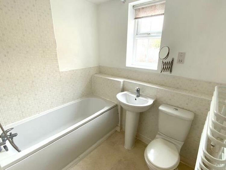 Fitted with a three piece suite comprising panelled bath with shower attachment, pedestal wash hand basin and low level wc. Part tiled walls, extractor fan, heated towel rail and obscure double glazed window.