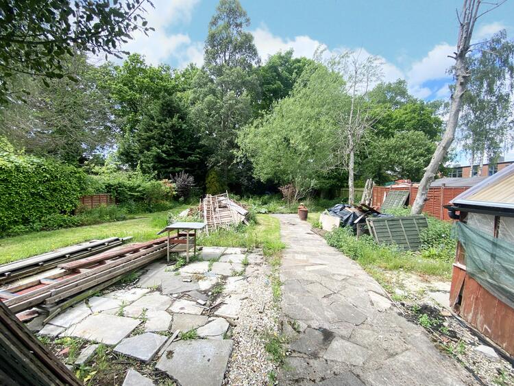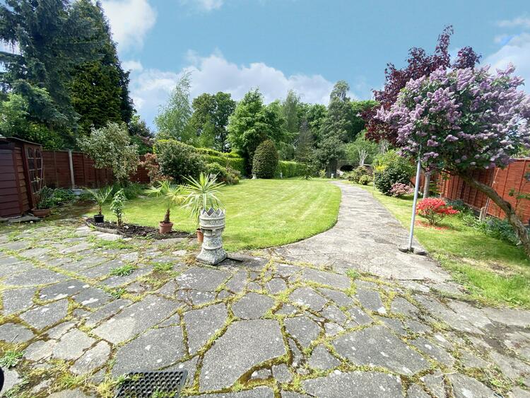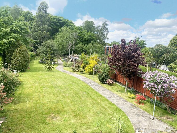 Being mainly laid to lawn with a crazy paved patio area, large timber built workshop, hedging and panelled fencing to boundaries and a crazy paved pathway extending to further gardens with a range of timber built potting sheds and mature trees