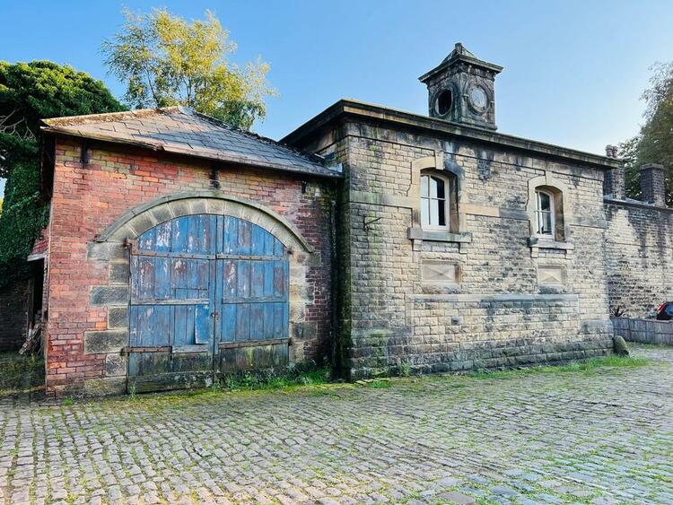The Coach House and Stables are presently unused and are approached by a stone setted yard leading to Andrew Lane. The immediate environs of the property are that of a residential courtyard this being the original farm yard. The Coach House is a striking stone and slate built building of imposing appearance with a prominent Clock Tower. The building is of dressed stone with hand worked quoins, cills and reliefs to windows, stone set corbelling and feature apex and elevation panels. The roof is of slate with hipped formed slopes. The Coach House is a later brick edition. Internally, The Stables provide a lofty area to an open trussed ceiling with heavy hand carving to stonework and impressive turned woodwork. The interior is remarkable in its detail indicating a true respect for the horses of the family. Horses were of course status symbols in their time much as we view cars today.
