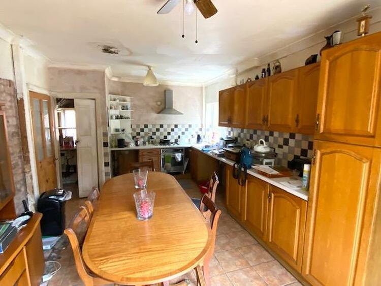 With uPVC double glazed window to the rear elevation and double glazed patio door to the side elevation. The fitted kitchen comprises a range of wall mounted cupboards with matching base units, drawers, preparation surface, sink and drainer, mixer tap and splashback tiling. Integrated appliances comprise an electric oven (not working) with a four ring gas hob, cooker hood over, central heating radiator and understair storage with window to side.