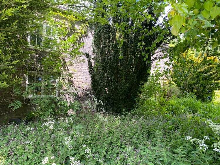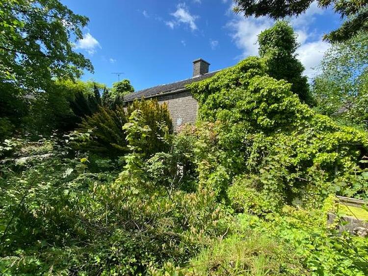 The property sites on a broadly rectangular shaped plot, screened by a range of specimen trees. The garden is overgrown and in need of attention.