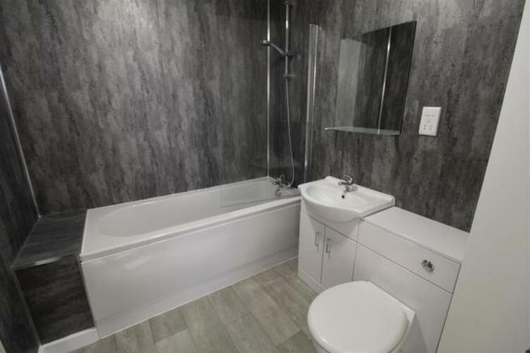 With modern, white suite comprising low flush w.c. wash hand basin and panel bath with shower over. Part tiled walls and extractor fan.