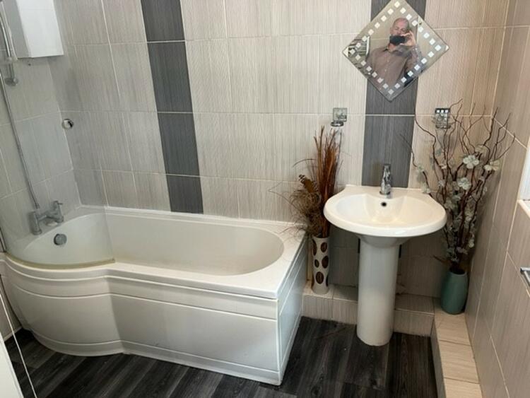 Modern suite comprising low flush w.c. wash hand basin and P shaped shower bath with shower over. Heated towel rail and window to front aspect.