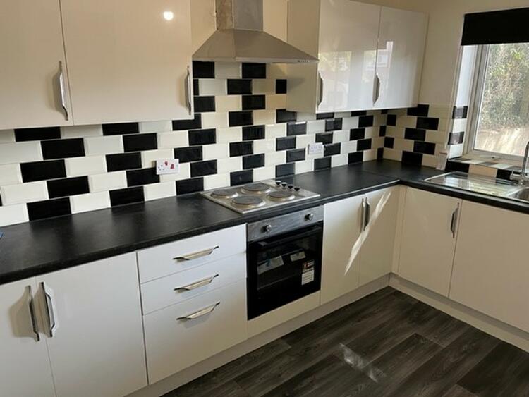 With refitted base and wall units, sink, integrated oven, hob and extractor and window to front aspect.