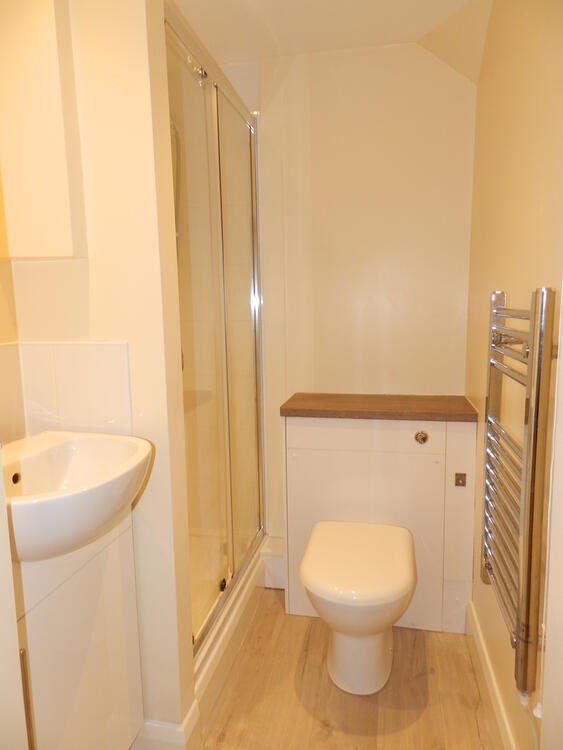 Comprising a generous sixed enclosed shower, concealed low level wc, vanity wash hand basin with cupboard beneath, range of down lighters, extractor fan, chrome laddered heated towel rail.