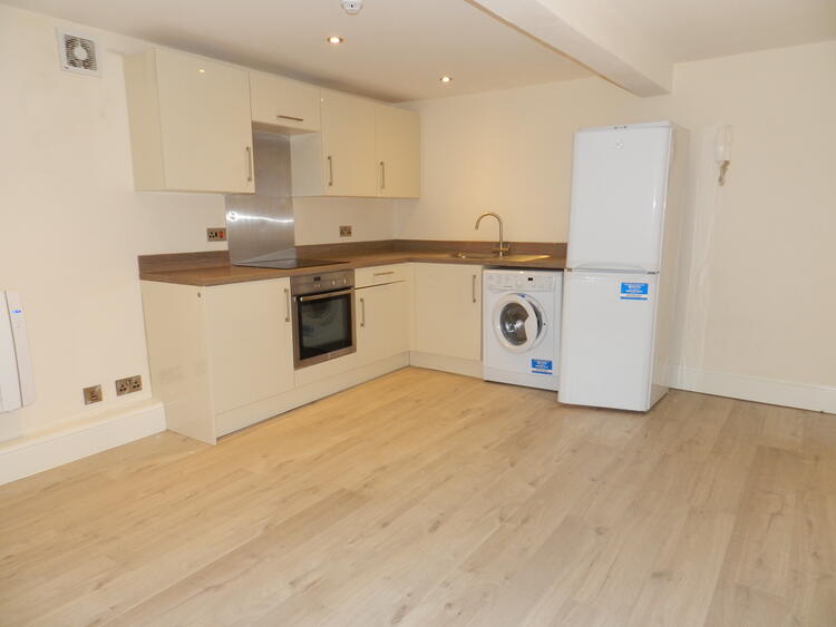 With double glazed window, quality refitted kitchen in gloss units comprising a range of wall mounted cupboards with matching base units, L-shaped preparation surface with a stainless steel Franke sink with mixer tap, Neff stainless steel built in electric oven, four ring hob, cooker hood over. Wood grain effect laminate floor covering, range of down-lighters, sprinkler system, power point, television point, electric panel heater and fire door.