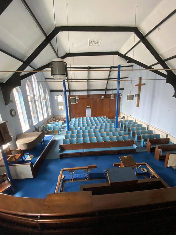Towards the eastern gable is a balcony with fixed pews, and accommodates the original organ. Under the balcony is the former Vestry, to entrance lobby, and boiler room.