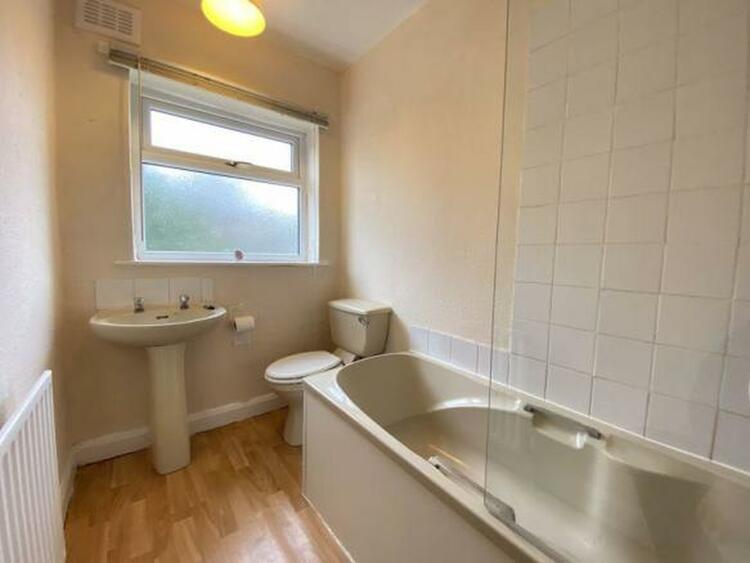 Comprising low flush w.c. wash hand basin and panel bath. Radiator, part tiled walls and window to rear.