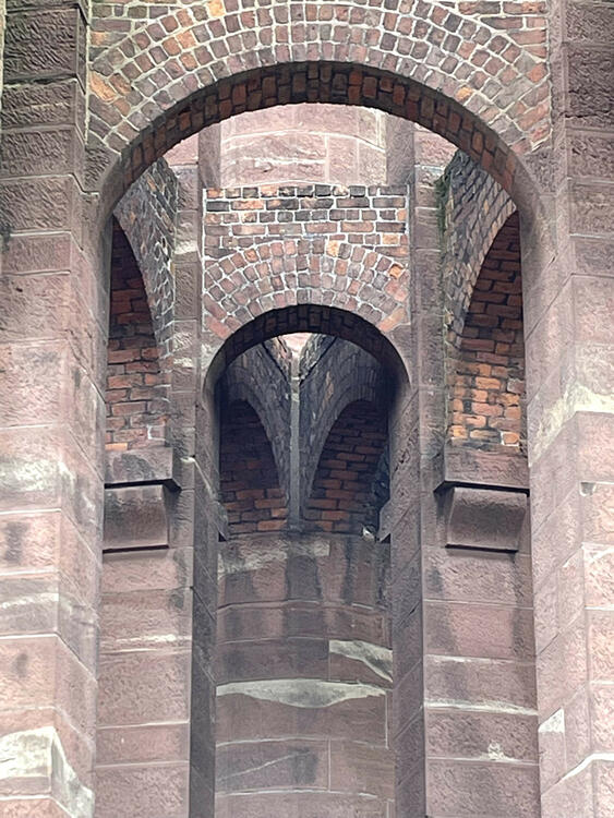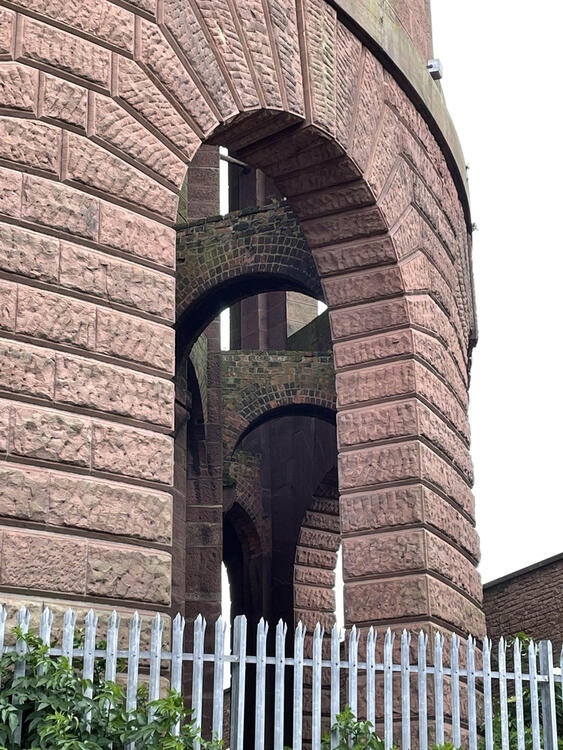 The tower consists of 3 stages. The first stage is made up of an arcade of 12 arches in a rusticated style. The second stage also consists of a 12 arch arcade with each arch having an impost band and keystone and a top bracketed cornice. The final stage is recessed and contains the water tank with iron supporting brackets.