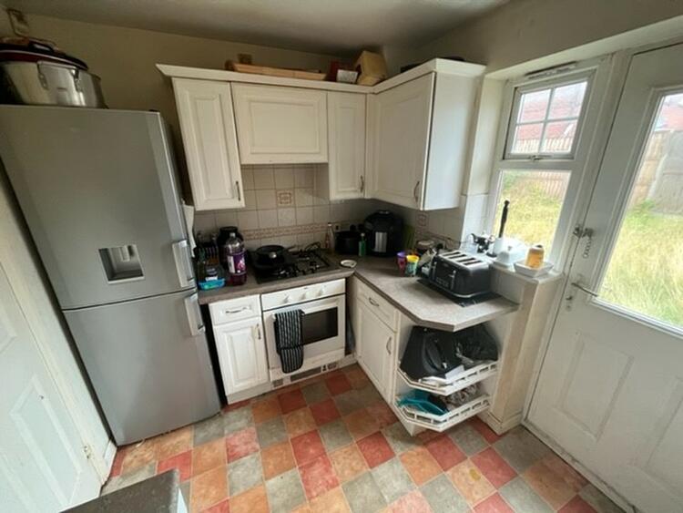 Having base and wall units, sink, oven, hob and extractor, space for appliances and both window and door to rear.