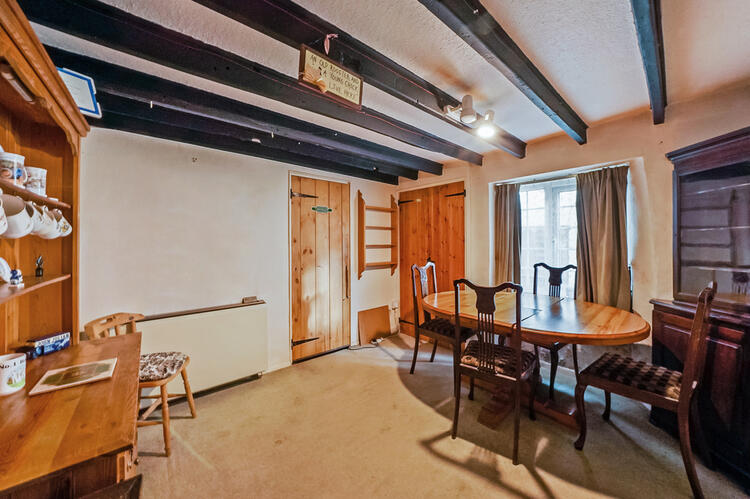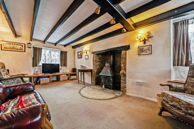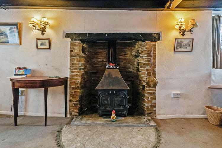 A gorgeous triple aspect room with beamed ceiling and inglenook fireplace with wood burning stove. Carpeted with night storage heater and selection of built-in storage
